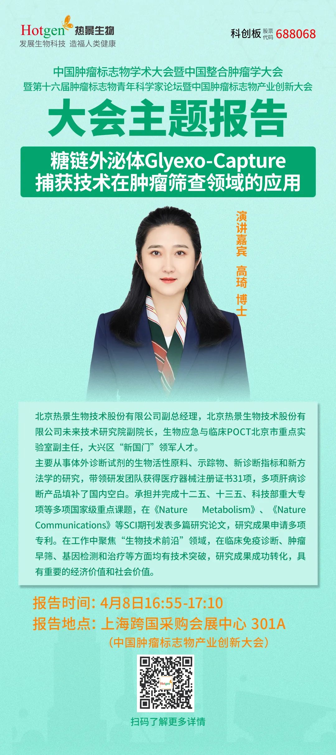 4月8日下午,北京熱景生物技術股份有限公司副總經理,北京熱景生物未來技術研究院副院長高琦博士受邀在中國腫瘤標志物產業創新大會分享創新技術報告《糖鏈外泌體Glyexo-Capture捕獲技術在腫瘤篩查領域的應用》。