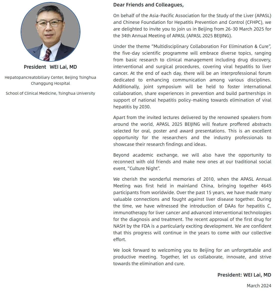 第34屆亞太肝病學會年會(APASL 2025)將于2025年3月26-30日在北京國家會議中心隆重舉行。大會以"多學科協作:肝病消除與治愈"(Multidisciplinary Collaboration For Elimination & Cure)為主題,由清華大學附屬北京清華長庚醫院魏來教授擔任主席,將匯聚全球肝病學頂尖專家,共同構建跨學科協作的創新范式。
