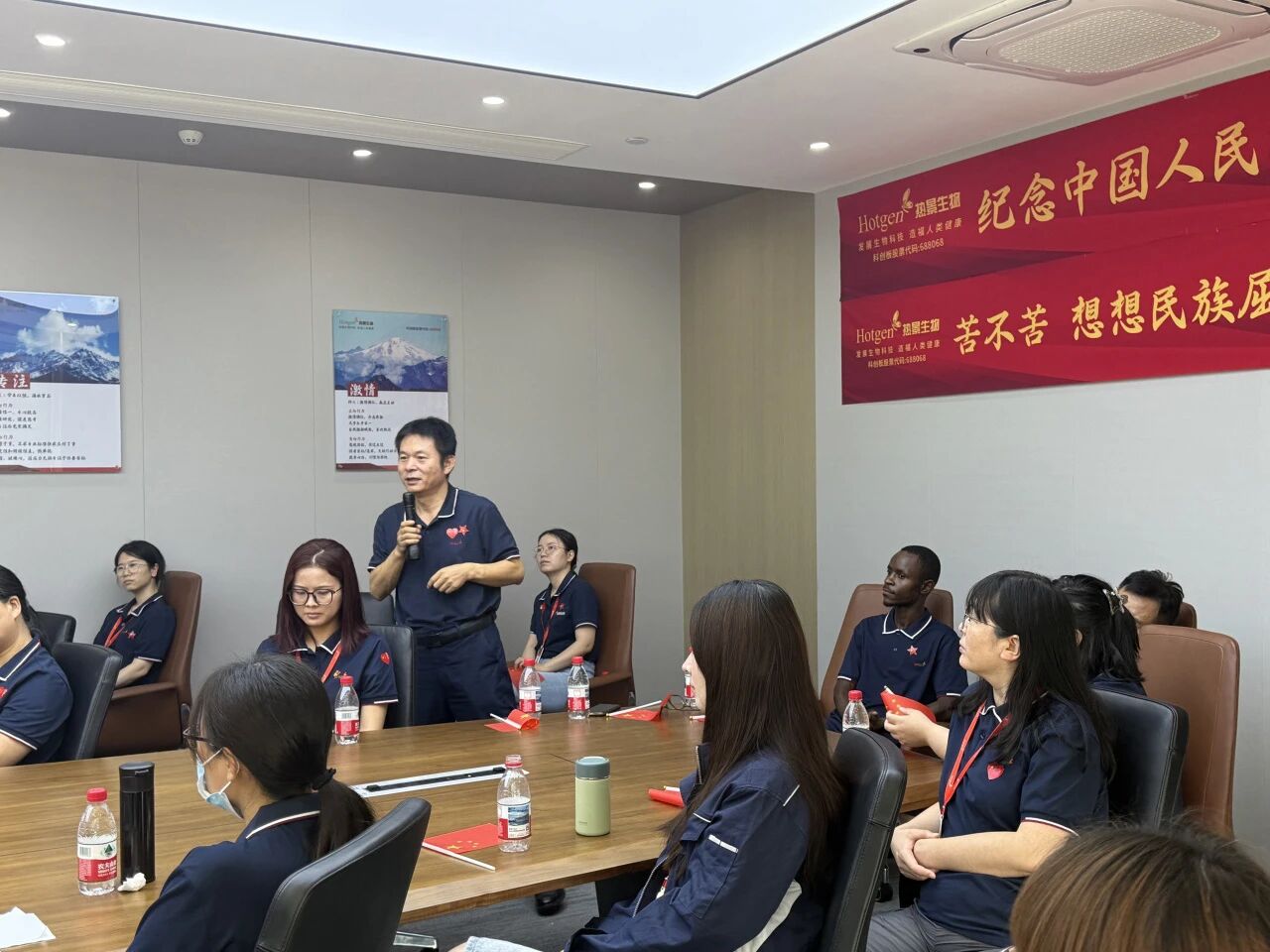 在觀看閱兵式后的交流討論中,各部門代表紛紛上臺發言,分享自己觀看九三閱兵儀式后的感受和體會。熱景生物副總經理石永沾表示,“看到咱們國家國防這么強,我特別自豪!新時代青年就得記著歷史、珍惜和平,就如同閱兵式上的將士們堅守崗位、履行使命一般,為企業發展和國家建設貢獻自己的力量,為守護人類健康貢獻自己的力量。”